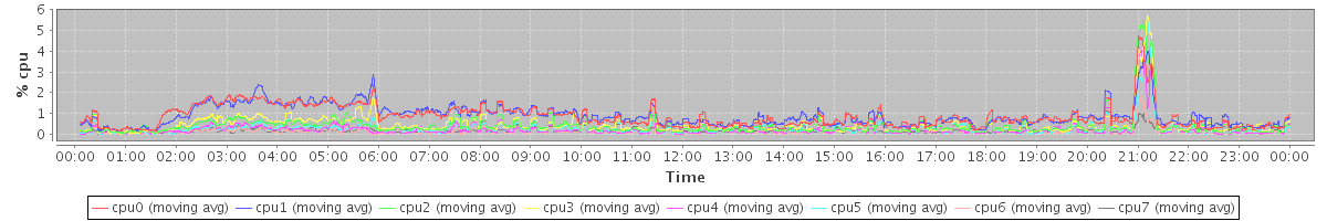 avg(cpu0) = 10.21 avg(cpu1) = 13.90 avg(cpu2) = 0.78 avg(cpu3) = 0.50 avg(cpu4) = 0.24 avg(cpu5) = 0.20 avg(cpu6) = 0.06 avg(cpu7) = 0.11