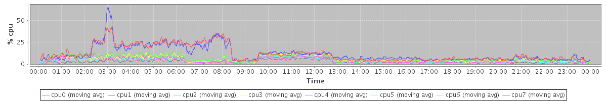 avg(cpu0) = 11.88 avg(cpu1) = 11.67 avg(cpu2) = 6.31 avg(cpu3) = 5.88 avg(cpu4) = 4.32 avg(cpu5) = 4.03 avg(cpu6) = 2.76 avg(cpu7) = 2.49