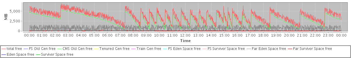 avg(total free) = 3727.68 avg(PS Old Gen free) = 0.00 avg(CMS Old Gen free) = 2851.34 avg(Tenured Gen free) = 0.00 avg(Train Gen free) = 0.00 avg(PS Eden Space free) = 0.00 avg(PS Survivor Space free) = 0.00 avg(Par Eden Space free) = 797.31 avg(Par Survivor Space free) = 79.03 avg(Eden Space free) = 0.00 avg(Survivor Space free) = 0.00