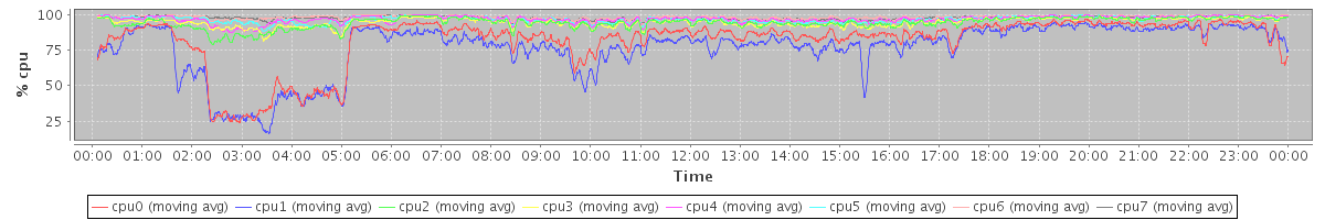 avg(cpu0) = 81.49 avg(cpu1) = 76.38 avg(cpu2) = 94.14 avg(cpu3) = 94.46 avg(cpu4) = 96.72 avg(cpu5) = 96.62 avg(cpu6) = 98.05 avg(cpu7) = 97.75