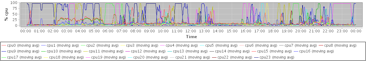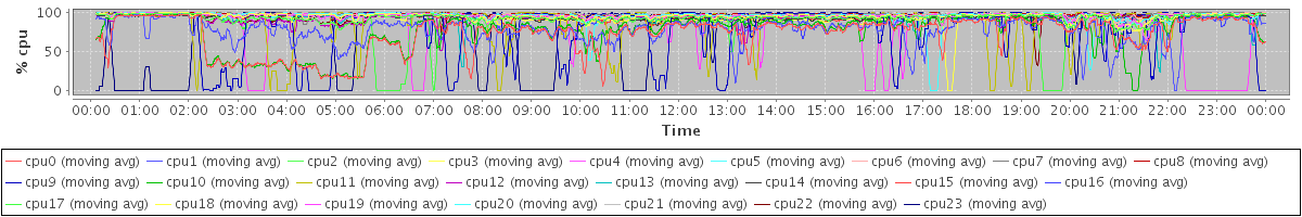 avg(cpu0) = 1.56 avg(cpu1) = 1.20 avg(cpu2) = 1.03 avg(cpu3) = 0.77 avg(cpu4) = 0.73 avg(cpu5) = 0.53 avg(cpu6) = 0.49 avg(cpu7) = 0.35 avg(cpu8) = 0.36 avg(cpu9) = 0.84 avg(cpu10) = 1.00 avg(cpu11) = 0.53 avg(cpu12) = 0.60 avg(cpu13) = 0.45 avg(cpu14) = 1.20 avg(cpu15) = 1.08 avg(cpu16) = 0.74 avg(cpu17) = 0.78 avg(cpu18) = 0.54 avg(cpu19) = 0.85 avg(cpu20) = 0.52 avg(cpu21) = 0.67 avg(cpu22) = 0.43 avg(cpu23) = 0.75