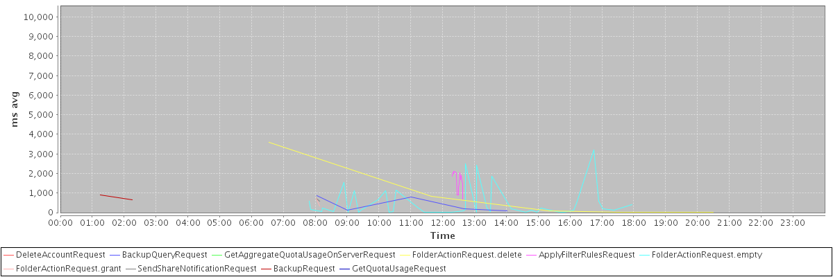 avg(DeleteAccountRequest) = 10073.00 avg(BackupQueryRequest) = 415.40 avg(GetAggregateQuotaUsageOnServerRequest) = 1375.00 avg(FolderActionRequest.delete) = 911.20 avg(ApplyFilterRulesRequest) = 1654.24 avg(FolderActionRequest.empty) = 505.83 avg(FolderActionRequest.grant) = 542.00 avg(SendShareNotificationRequest) = 642.00 avg(BackupRequest) = 777.50 avg(GetQuotaUsageRequest) = 1458.00
