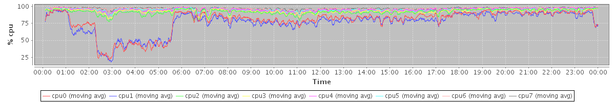 avg(cpu0) = 1.45 avg(cpu1) = 1.36 avg(cpu2) = 1.03 avg(cpu3) = 0.95 avg(cpu4) = 0.71 avg(cpu5) = 0.61 avg(cpu6) = 0.45 avg(cpu7) = 0.40