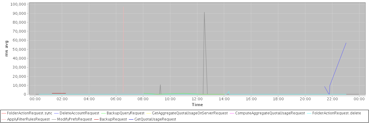 avg(FolderActionRequest.sync) = 813.00 avg(DeleteAccountRequest) = 12900.50 avg(BackupQueryRequest) = 574.40 avg(GetAggregateQuotaUsageOnServerRequest) = 1394.00 avg(ComputeAggregateQuotaUsageRequest) = 1829.00 avg(FolderActionRequest.delete) = 577.43 avg(ApplyFilterRulesRequest) = 49901.50 avg(ModifyPrefsRequest) = 472.29 avg(BackupRequest) = 1323.00 avg(GetQuotaUsageRequest) = 1443.00