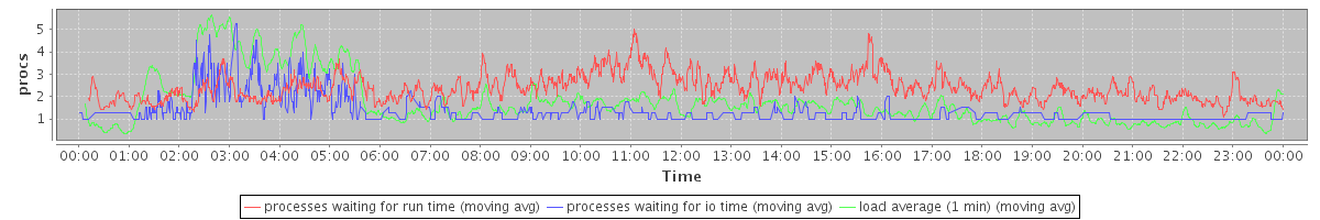 avg(processes waiting for run time) = 2.06 avg(processes waiting for io time) = 0.56 avg(load average (1 min)) = 1.73