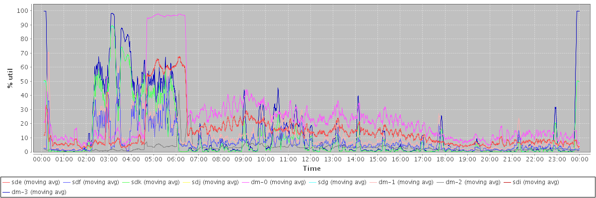 avg(sde) = 14.89 avg(sdf) = 7.85 avg(sdk) = 10.48 avg(sdj) = 7.86 avg(dm-0) = 24.39 avg(sdg) = 10.46 avg(dm-1) = 10.48 avg(dm-2) = 3.01 avg(sdi) = 14.88 avg(dm-3) = 14.43