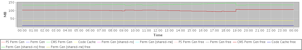 avg(PS Perm Gen) = 0.00 avg(Perm Gen) = 0.00 avg(CMS Perm Gen) = 135.82 avg(Code Cache) = 38.39 avg(Perm Gen [shared-ro]) = 0.00 avg(Perm Gen [shared-rw]) = 0.00 avg(PS Perm Gen free) = 0.00 avg(Perm Gen free) = 0.00 avg(CMS Perm Gen free) = 101.20 avg(Code Cache free) = 8.30 avg(Perm Gen [shared-ro] free) = 0.00 avg(Perm Gen [shared-rw] free) = 0.00