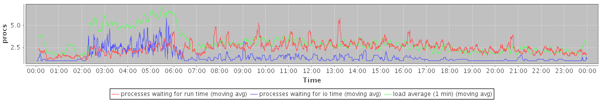 avg(processes waiting for run time) = 2.47 avg(processes waiting for io time) = 0.75 avg(load average (1 min)) = 3.07