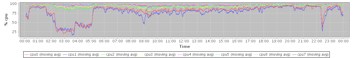 avg(cpu0) = 1.15 avg(cpu1) = 1.11 avg(cpu2) = 0.73 avg(cpu3) = 0.73 avg(cpu4) = 0.48 avg(cpu5) = 0.49 avg(cpu6) = 0.34 avg(cpu7) = 0.35