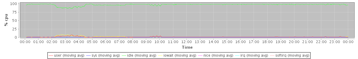 avg(user) = 1.54 avg(sys) = 0.31 avg(idle) = 97.05 avg(iowait) = 1.07 avg(nice) = 0.00 avg(irq) = 0.00 avg(softirq) = 0.01