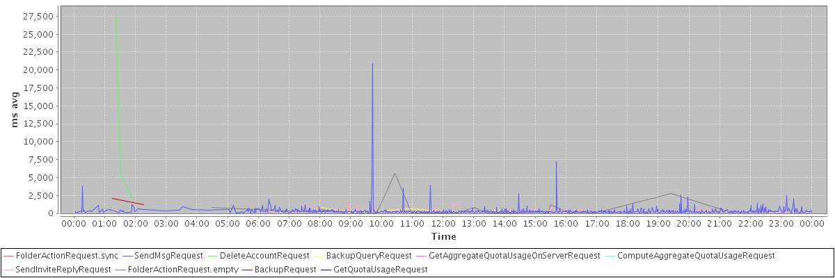 avg(FolderActionRequest.sync) = 547.00 avg(SendMsgRequest) = 326.39 avg(DeleteAccountRequest) = 11663.33 avg(BackupQueryRequest) = 437.60 avg(GetAggregateQuotaUsageOnServerRequest) = 1081.00 avg(ComputeAggregateQuotaUsageRequest) = 1863.00 avg(SendInviteReplyRequest) = 297.90 avg(FolderActionRequest.empty) = 396.72 avg(BackupRequest) = 1608.00 avg(GetQuotaUsageRequest) = 1205.00