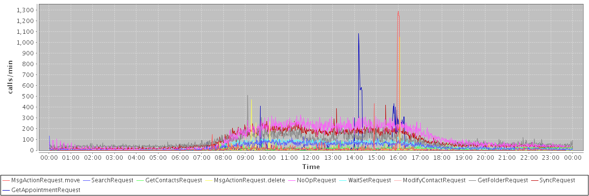 max(MsgActionRequest.move) = 1294.00 max(SearchRequest) = 132.00 max(GetContactsRequest) = 94.00 max(MsgActionRequest.delete) = 1055.00 max(NoOpRequest) = 330.00 max(WaitSetRequest) = 127.00 max(ModifyContactRequest) = 231.00 max(GetFolderRequest) = 512.00 max(SyncRequest) = 419.00 max(GetAppointmentRequest) = 1086.00