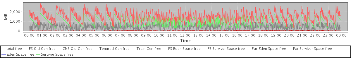 avg(total free) = 1503.94 avg(PS Old Gen free) = 0.00 avg(CMS Old Gen free) = 980.50 avg(Tenured Gen free) = 0.00 avg(Train Gen free) = 0.00 avg(PS Eden Space free) = 0.00 avg(PS Survivor Space free) = 0.00 avg(Par Eden Space free) = 466.89 avg(Par Survivor Space free) = 56.55 avg(Eden Space free) = 0.00 avg(Survivor Space free) = 0.00