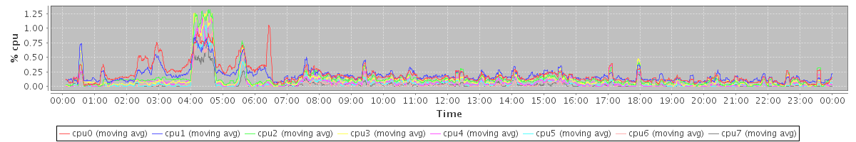 avg(cpu0) = 1.26 avg(cpu1) = 1.17 avg(cpu2) = 0.89 avg(cpu3) = 0.81 avg(cpu4) = 0.63 avg(cpu5) = 0.56 avg(cpu6) = 0.44 avg(cpu7) = 0.39