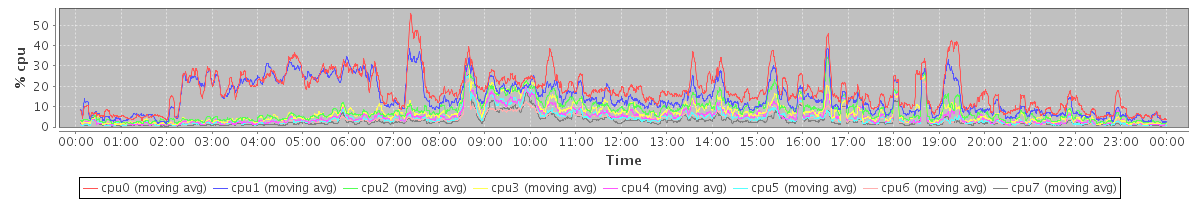 avg(cpu0) = 16.99 avg(cpu1) = 10.12 avg(cpu2) = 0.81 avg(cpu3) = 0.97 avg(cpu4) = 0.44 avg(cpu5) = 0.35 avg(cpu6) = 0.23 avg(cpu7) = 0.12