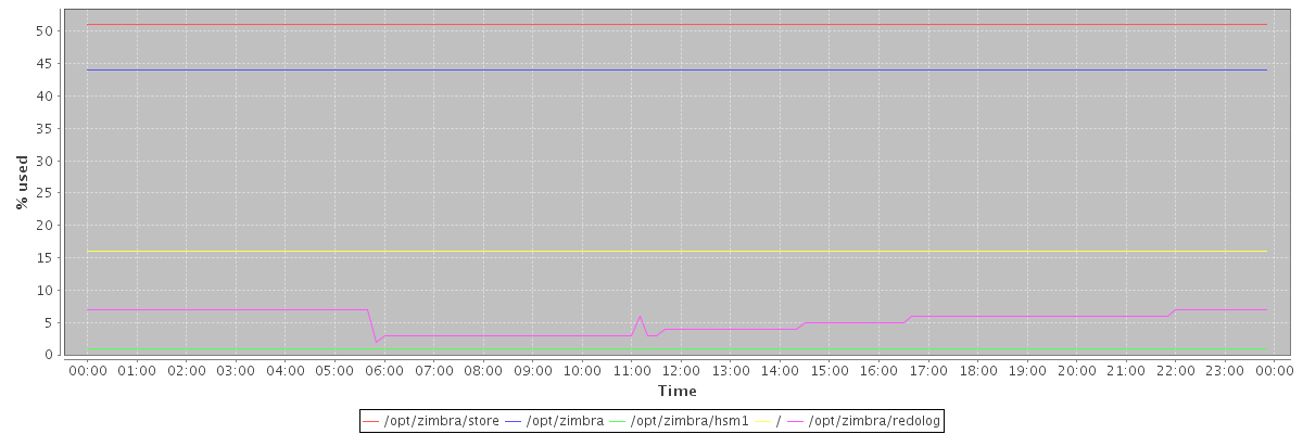 avg(/opt/zimbra/store) = 51.00 avg(/opt/zimbra) = 44.00 avg(/opt/zimbra/hsm1) = 1.00 avg(/) = 16.00 avg(/opt/zimbra/redolog) = 5.28