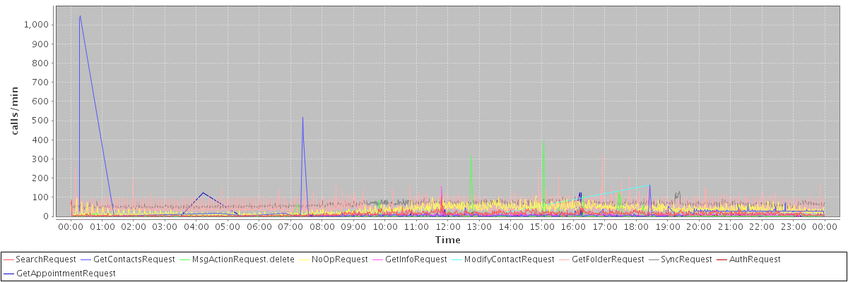 max(SearchRequest) = 97.00 max(GetContactsRequest) = 1047.00 max(MsgActionRequest.delete) = 394.00 max(NoOpRequest) = 108.00 max(GetInfoRequest) = 157.00 max(ModifyContactRequest) = 162.00 max(GetFolderRequest) = 323.00 max(SyncRequest) = 132.00 max(AuthRequest) = 156.00 max(GetAppointmentRequest) = 124.00