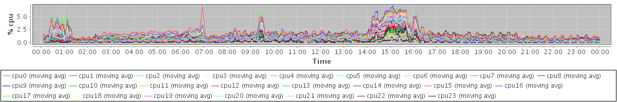 avg(cpu0) = 0.37 avg(cpu1) = 0.30 avg(cpu2) = 0.23 avg(cpu3) = 0.23 avg(cpu4) = 0.17 avg(cpu5) = 0.14 avg(cpu6) = 0.09 avg(cpu7) = 0.08 avg(cpu8) = 0.06 avg(cpu9) = 0.04 avg(cpu10) = 0.04 avg(cpu11) = 0.02 avg(cpu12) = 0.11 avg(cpu13) = 0.09 avg(cpu14) = 0.15 avg(cpu15) = 0.10 avg(cpu16) = 0.09 avg(cpu17) = 0.08 avg(cpu18) = 0.09 avg(cpu19) = 0.06 avg(cpu20) = 0.05 avg(cpu21) = 0.01 avg(cpu22) = 0.01 avg(cpu23) = 0.00