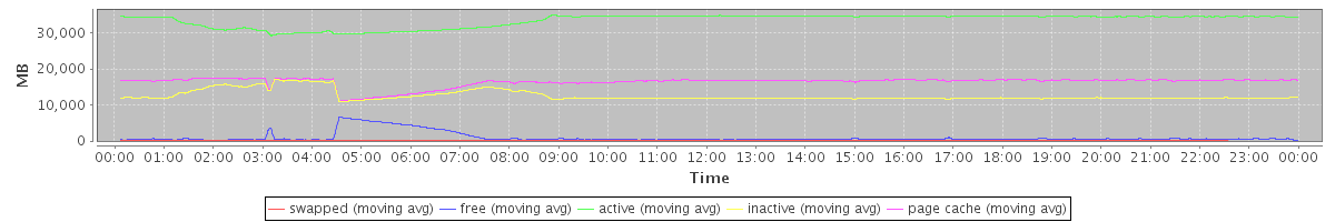 avg(swapped) = 0.40 avg(free) = 916.40 avg(active) = 33445.95 avg(inactive) = 12569.52 avg(page cache) = 16365.38