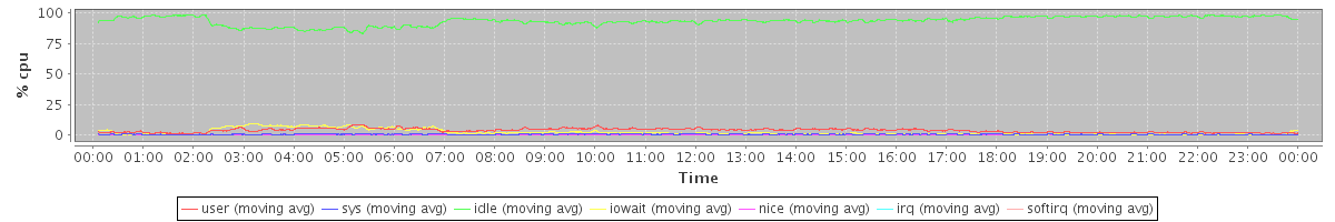 avg(user) = 3.68 avg(sys) = 0.53 avg(idle) = 93.56 avg(iowait) = 2.16 avg(nice) = 0.00 avg(irq) = 0.00 avg(softirq) = 0.07