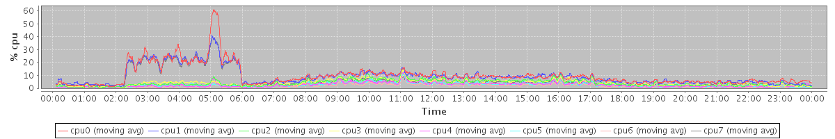 avg(cpu0) = 18.81 avg(cpu1) = 10.07 avg(cpu2) = 0.73 avg(cpu3) = 0.95 avg(cpu4) = 0.32 avg(cpu5) = 0.30 avg(cpu6) = 0.15 avg(cpu7) = 10.95
