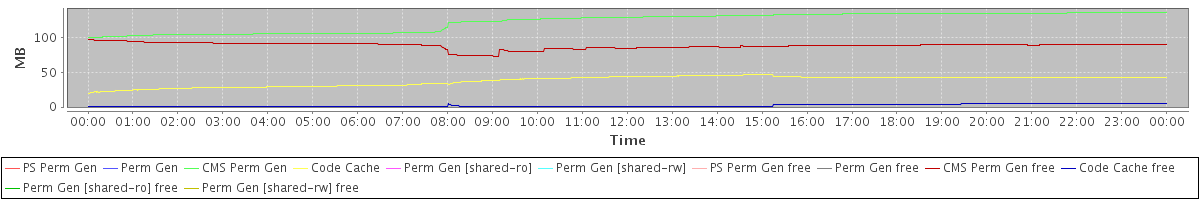 avg(PS Perm Gen) = 0.00 avg(Perm Gen) = 0.00 avg(CMS Perm Gen) = 122.27 avg(Code Cache) = 37.63 avg(Perm Gen [shared-ro]) = 0.00 avg(Perm Gen [shared-rw]) = 0.00 avg(PS Perm Gen free) = 0.00 avg(Perm Gen free) = 0.00 avg(CMS Perm Gen free) = 87.84 avg(Code Cache free) = 1.83 avg(Perm Gen [shared-ro] free) = 0.00 avg(Perm Gen [shared-rw] free) = 0.00