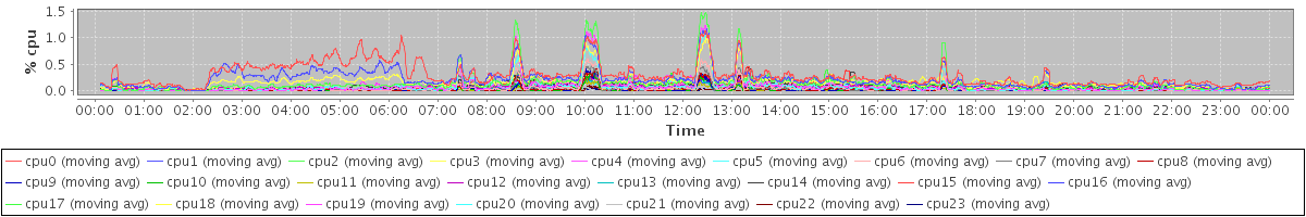 avg(cpu0) = 1.51 avg(cpu1) = 1.24 avg(cpu2) = 0.93 avg(cpu3) = 1.14 avg(cpu4) = 0.67 avg(cpu5) = 0.63 avg(cpu6) = 0.46 avg(cpu7) = 0.39 avg(cpu8) = 0.31 avg(cpu9) = 0.25 avg(cpu10) = 0.21 avg(cpu11) = 0.20 avg(cpu12) = 0.65 avg(cpu13) = 0.45 avg(cpu14) = 0.93 avg(cpu15) = 1.04 avg(cpu16) = 0.61 avg(cpu17) = 0.68 avg(cpu18) = 0.69 avg(cpu19) = 0.68 avg(cpu20) = 0.44 avg(cpu21) = 0.23 avg(cpu22) = 0.17 avg(cpu23) = 0.17