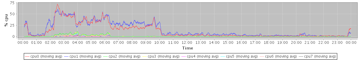 avg(cpu0) = 12.21 avg(cpu1) = 14.78 avg(cpu2) = 0.89 avg(cpu3) = 0.55 avg(cpu4) = 0.23 avg(cpu5) = 0.29 avg(cpu6) = 0.07 avg(cpu7) = 0.26