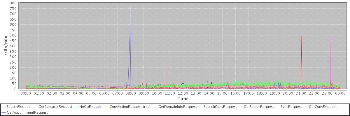 max(SearchRequest) = 92.00 max(GetContactsRequest) = 769.00 max(NoOpRequest) = 92.00 max(ConvActionRequest.trash) = 48.00 max(GetDomainInfoRequest) = 476.00 max(SearchConvRequest) = 54.00 max(GetFolderRequest) = 241.00 max(SyncRequest) = 76.00 max(GetConvRequest) = 493.00 max(GetAppointmentRequest) = 62.00