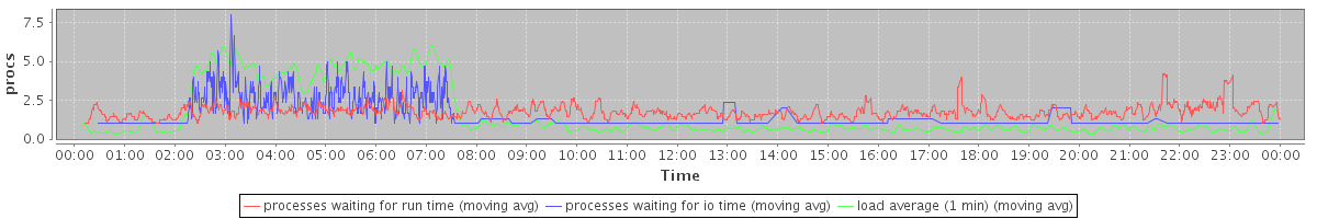 avg(processes waiting for run time) = 1.18 avg(processes waiting for io time) = 0.64 avg(load average (1 min)) = 1.57