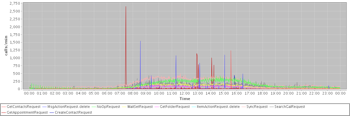 max(GetContactsRequest) = 1237.00 max(MsgActionRequest.delete) = 1540.00 max(NoOpRequest) = 435.00 max(WaitSetRequest) = 228.00 max(GetFolderRequest) = 175.00 max(ItemActionRequest.delete) = 164.00 max(SyncRequest) = 494.00 max(SearchGalRequest) = 434.00 max(GetAppointmentRequest) = 2654.00 max(CreateContactRequest) = 440.00