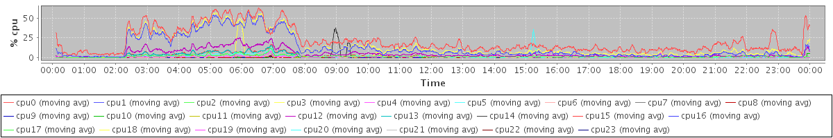 avg(cpu0) = 0.29 avg(cpu1) = 0.19 avg(cpu2) = 0.13 avg(cpu3) = 0.14 avg(cpu4) = 0.08 avg(cpu5) = 0.06 avg(cpu6) = 0.04 avg(cpu7) = 0.03 avg(cpu8) = 0.02 avg(cpu9) = 0.01 avg(cpu10) = 0.01 avg(cpu11) = 0.01 avg(cpu12) = 0.06 avg(cpu13) = 0.02 avg(cpu14) = 0.09 avg(cpu15) = 0.09 avg(cpu16) = 0.06 avg(cpu17) = 0.05 avg(cpu18) = 0.11 avg(cpu19) = 0.04 avg(cpu20) = 0.04 avg(cpu21) = 0.00 avg(cpu22) = 0.00 avg(cpu23) = 0.00