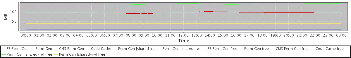 avg(PS Perm Gen) = 0.00 avg(Perm Gen) = 0.00 avg(CMS Perm Gen) = 137.17 avg(Code Cache) = 38.73 avg(Perm Gen [shared-ro]) = 0.00 avg(Perm Gen [shared-rw]) = 0.00 avg(PS Perm Gen free) = 0.00 avg(Perm Gen free) = 0.00 avg(CMS Perm Gen free) = 94.43 avg(Code Cache free) = 7.89 avg(Perm Gen [shared-ro] free) = 0.00 avg(Perm Gen [shared-rw] free) = 0.00