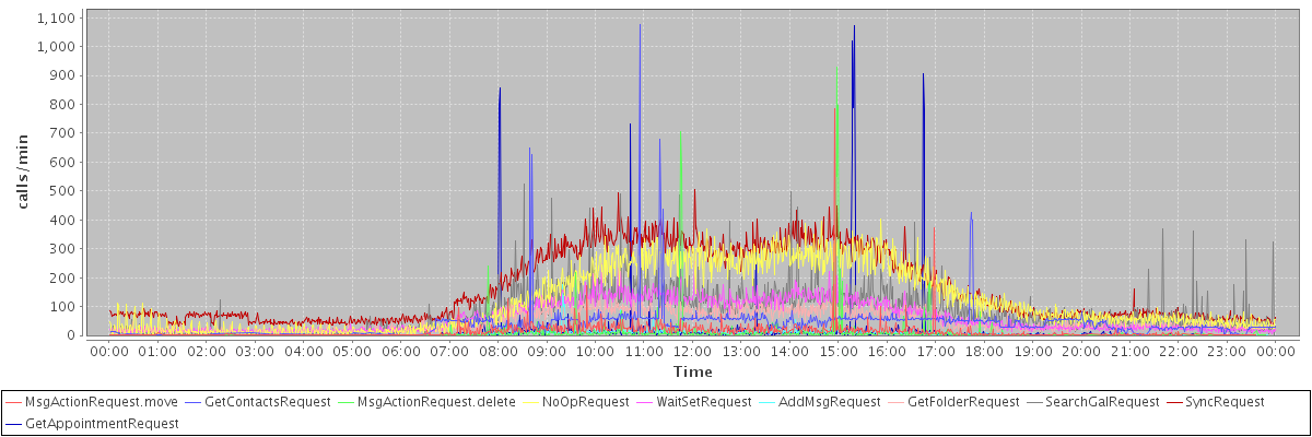max(MsgActionRequest.move) = 783.00 max(GetContactsRequest) = 1077.00 max(MsgActionRequest.delete) = 930.00 max(NoOpRequest) = 401.00 max(WaitSetRequest) = 254.00 max(AddMsgRequest) = 174.00 max(GetFolderRequest) = 178.00 max(SearchGalRequest) = 525.00 max(SyncRequest) = 505.00 max(GetAppointmentRequest) = 1074.00