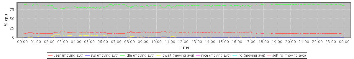 avg(user) = 12.26 avg(sys) = 0.57 avg(idle) = 85.25 avg(iowait) = 1.85 avg(nice) = 0.00 avg(irq) = 0.00 avg(softirq) = 0.07
