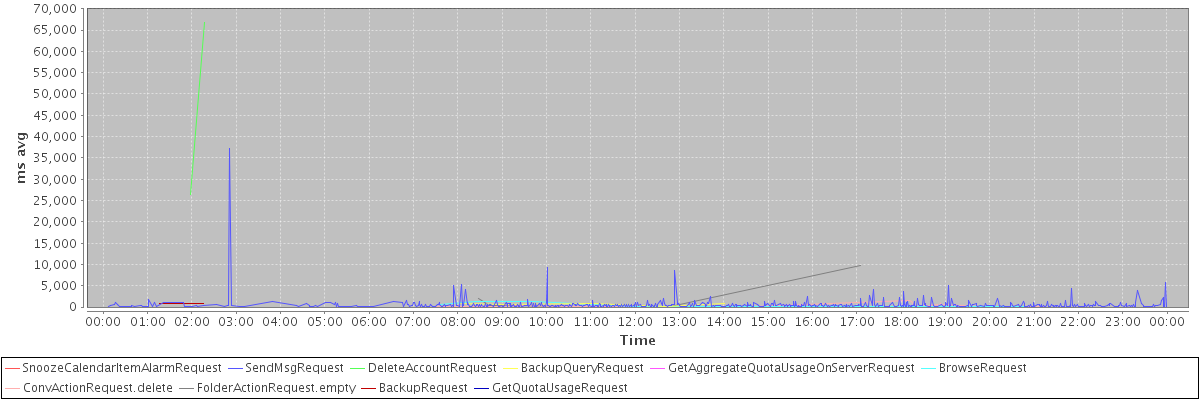 avg(SnoozeCalendarItemAlarmRequest) = 835.00 avg(SendMsgRequest) = 542.94 avg(DeleteAccountRequest) = 46568.50 avg(BackupQueryRequest) = 643.40 avg(GetAggregateQuotaUsageOnServerRequest) = 1469.00 avg(BrowseRequest) = 556.00 avg(ConvActionRequest.delete) = 380.29 avg(FolderActionRequest.empty) = 2128.67 avg(BackupRequest) = 864.50 avg(GetQuotaUsageRequest) = 1608.00