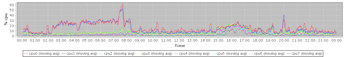 avg(cpu0) = 16.79 avg(cpu1) = 11.56 avg(cpu2) = 0.79 avg(cpu3) = 1.28 avg(cpu4) = 0.43 avg(cpu5) = 0.42 avg(cpu6) = 0.22 avg(cpu7) = 0.13
