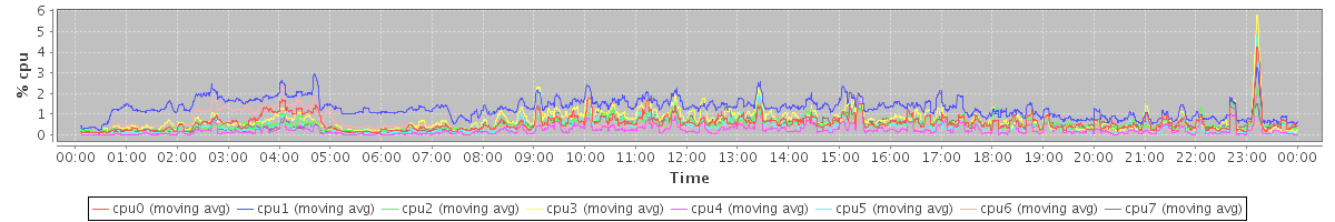 avg(cpu0) = 0.55 avg(cpu1) = 14.41 avg(cpu2) = 0.25 avg(cpu3) = 0.36 avg(cpu4) = 0.09 avg(cpu5) = 0.15 avg(cpu6) = 5.99 avg(cpu7) = 0.20