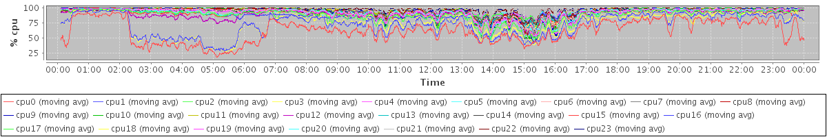 avg(cpu0) = 1.61 avg(cpu1) = 1.27 avg(cpu2) = 1.03 avg(cpu3) = 1.19 avg(cpu4) = 0.76 avg(cpu5) = 0.66 avg(cpu6) = 0.58 avg(cpu7) = 0.47 avg(cpu8) = 0.40 avg(cpu9) = 0.29 avg(cpu10) = 0.28 avg(cpu11) = 0.24 avg(cpu12) = 0.79 avg(cpu13) = 0.51 avg(cpu14) = 0.96 avg(cpu15) = 1.05 avg(cpu16) = 0.96 avg(cpu17) = 0.72 avg(cpu18) = 0.76 avg(cpu19) = 0.58 avg(cpu20) = 0.49 avg(cpu21) = 0.26 avg(cpu22) = 0.19 avg(cpu23) = 0.21