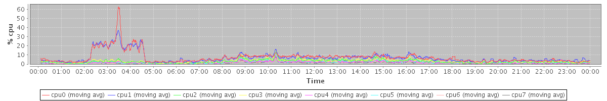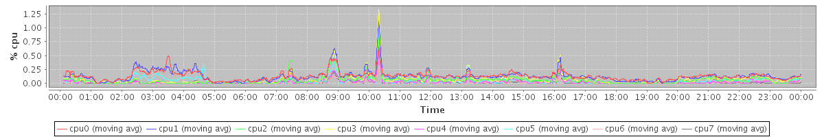 avg(cpu0) = 9.24 avg(cpu1) = 5.89 avg(cpu2) = 0.32 avg(cpu3) = 0.52 avg(cpu4) = 0.15 avg(cpu5) = 0.20 avg(cpu6) = 0.05 avg(cpu7) = 0.05