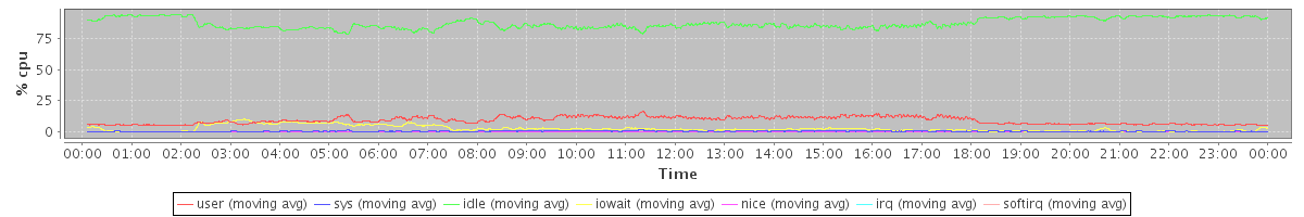 avg(user) = 9.24 avg(sys) = 0.53 avg(idle) = 87.56 avg(iowait) = 2.59 avg(nice) = 0.00 avg(irq) = 0.00 avg(softirq) = 0.07