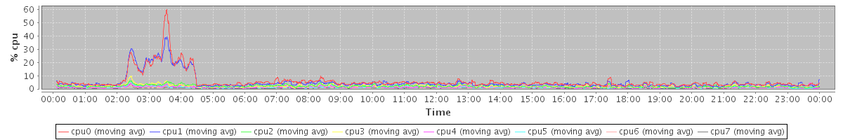 avg(cpu0) = 11.17 avg(cpu1) = 5.83 avg(cpu2) = 0.31 avg(cpu3) = 0.46 avg(cpu4) = 0.13 avg(cpu5) = 0.15 avg(cpu6) = 0.04 avg(cpu7) = 0.06