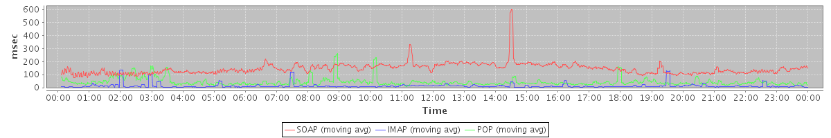 avg(SendMsgRequest) = 321.55 avg(DeleteAccountRequest) = 9246.67 avg(BackupQueryRequest) = 626.60 avg(GetAggregateQuotaUsageOnServerRequest) = 1099.00 avg(ComputeAggregateQuotaUsageRequest) = 1874.00 avg(SendInviteReplyRequest) = 384.55 avg(ApplyFilterRulesRequest) = 1805.30 avg(FolderActionRequest.empty) = 1401.56 avg(BackupRequest) = 974.00 avg(GetQuotaUsageRequest) = 1185.00