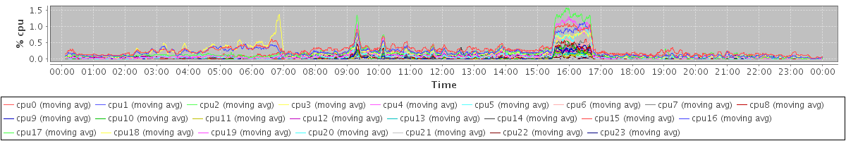 avg(cpu0) = 1.51 avg(cpu1) = 1.28 avg(cpu2) = 1.12 avg(cpu3) = 1.21 avg(cpu4) = 0.84 avg(cpu5) = 0.69 avg(cpu6) = 0.57 avg(cpu7) = 0.47 avg(cpu8) = 0.41 avg(cpu9) = 0.31 avg(cpu10) = 0.29 avg(cpu11) = 0.22 avg(cpu12) = 0.70 avg(cpu13) = 0.45 avg(cpu14) = 0.94 avg(cpu15) = 1.38 avg(cpu16) = 0.63 avg(cpu17) = 0.67 avg(cpu18) = 0.57 avg(cpu19) = 0.49 avg(cpu20) = 0.46 avg(cpu21) = 0.23 avg(cpu22) = 0.20 avg(cpu23) = 0.20
