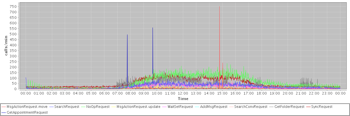 max(MsgActionRequest.move) = 751.00 max(SearchRequest) = 105.00 max(NoOpRequest) = 233.00 max(MsgActionRequest.update) = 162.00 max(WaitSetRequest) = 77.00 max(AddMsgRequest) = 68.00 max(SearchConvRequest) = 80.00 max(GetFolderRequest) = 165.00 max(SyncRequest) = 162.00 max(GetAppointmentRequest) = 559.00