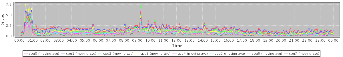 avg(cpu0) = 0.26 avg(cpu1) = 0.30 avg(cpu2) = 0.21 avg(cpu3) = 0.21 avg(cpu4) = 0.13 avg(cpu5) = 0.11 avg(cpu6) = 0.06 avg(cpu7) = 0.07