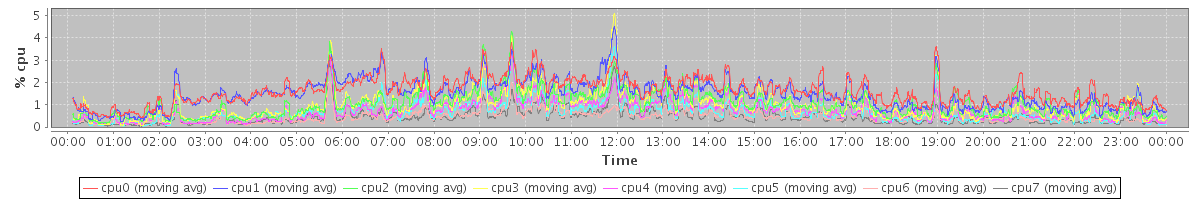avg(cpu0) = 19.43 avg(cpu1) = 11.62 avg(cpu2) = 0.72 avg(cpu3) = 0.93 avg(cpu4) = 0.36 avg(cpu5) = 0.34 avg(cpu6) = 0.15 avg(cpu7) = 0.12