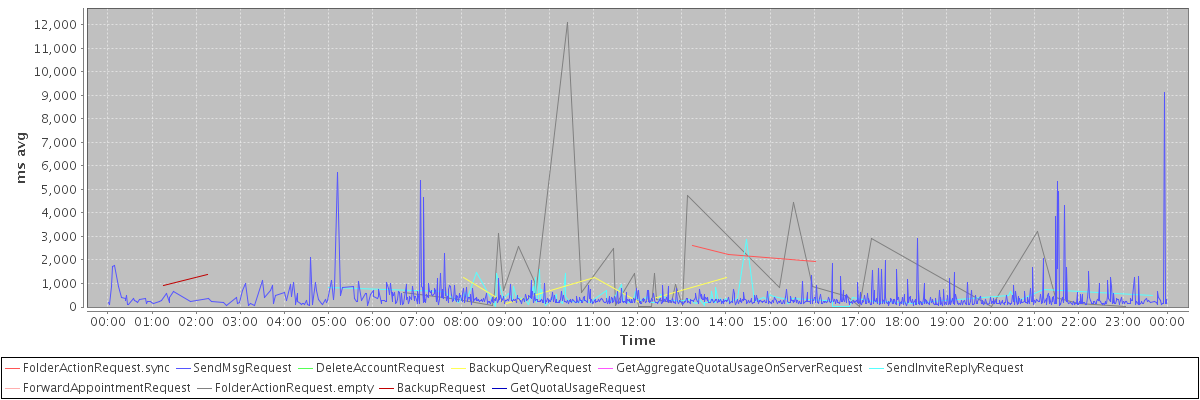 avg(FolderActionRequest.sync) = 2264.00 avg(SendMsgRequest) = 373.79 avg(DeleteAccountRequest) = 10798.00 avg(BackupQueryRequest) = 826.40 avg(GetAggregateQuotaUsageOnServerRequest) = 1181.00 avg(SendInviteReplyRequest) = 398.98 avg(ForwardAppointmentRequest) = 2627.00 avg(FolderActionRequest.empty) = 1390.11 avg(BackupRequest) = 1130.50 avg(GetQuotaUsageRequest) = 1293.00