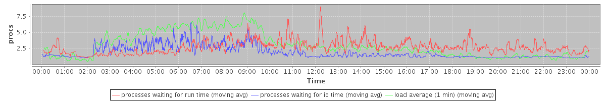 avg(processes waiting for run time) = 2.33 avg(processes waiting for io time) = 1.28 avg(load average (1 min)) = 2.97