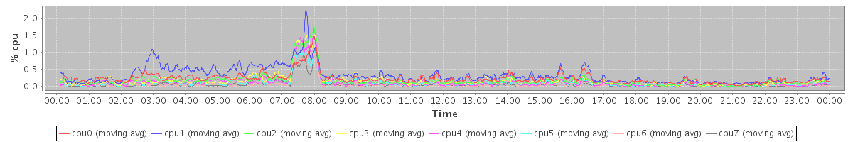 avg(cpu0) = 1.50 avg(cpu1) = 1.52 avg(cpu2) = 1.06 avg(cpu3) = 1.05 avg(cpu4) = 0.74 avg(cpu5) = 0.70 avg(cpu6) = 0.50 avg(cpu7) = 0.49